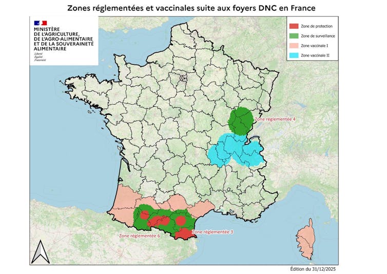 La dermatose nodulaire contagieuse (DNC) a atteint la France en Savoie le 29 juin 2025 à la suite de l’introduction d’un bovin infecté venant d’Italie. La France métropolitaine étant alors indemne de la DNC, la réglementation européenne prévue (dépeuplement total, vaccination d’urgence au sein des zones réglementées (ZR) – instaurées par arrêté préfectoral, limitation des mouvements des bovins…] a été mise en place, ce qui a permis d’éliminer le virus dans la région dès le 21 août.